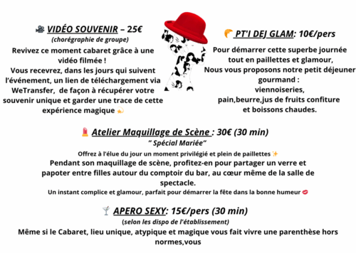 Une immersion totale dans l’univers du Music-Hall, parfaite pour un EVJF qui allie fun, élégance et souvenirs mémorables.